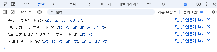 console.log("5로 나눈 나머지가 0인 수만 추출:", divisibleByFive);